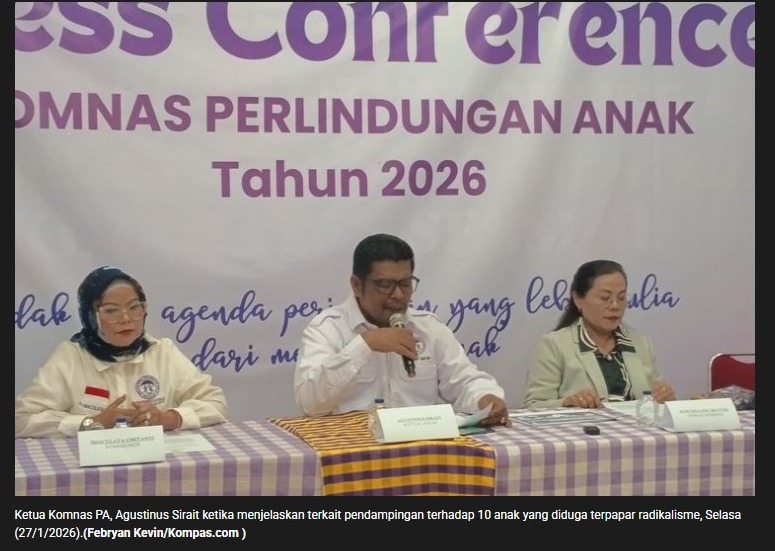 Komisi Nasional Perlindungan Anak (Komnas PA) tengah melakukan pendampingan terhadap 10 anak yang diduga terpapar paham radikalisme melalui media sosial, terutama di wilayah Provinsi Banten. Ketua Komnas PA Agustinus Sirait mengatakan, paparan tersebut diketahui setelah aparat penegak hukum melakukan penelusuran terhadap aktivitas anak-anak di ruang digital. \"Bahwa memang benar ada sejumlah anak-anak kita, terutama yang di Provinsi Banten, ada 10 anak yang terpapar paham radikalisme melalui sosial media,\" ujar Agustinus Sirait di Kantor Komnas PA, Selasa (27/1/2026).